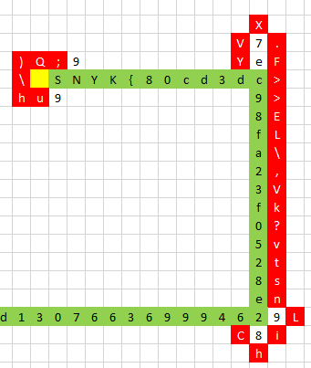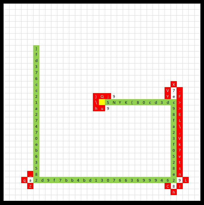This is a perfect example of being blinded by an assumption. For so long I was convinced this would turn out to be a QR code. If I had just looked a bit harder near the start when looking for the light grey curly braces pixels I would have found them and almost instantly would have solved the challenge. I have no doubt that the Snyky people at Snyk deliberately made the image the right size to send us down the wrong path.