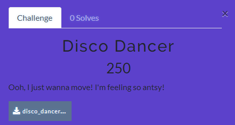 I decided to throw myself in the deep end and go for one of the challenges that hadn’t been solved. Other challenges already had blog post solution and I didn’t want to have a way out if I got stuck. The challenge was called ‘Disco Dancer’ and it consisted of an image and the description ‘Ooh, I just wanna move! I’m feeling so antsy!’. Typically the description is meant to contain clues to how to solve the challenge. I read this over and over trying to click with something in my brain. With nothing concrete I decided to analyse the image for ideas.